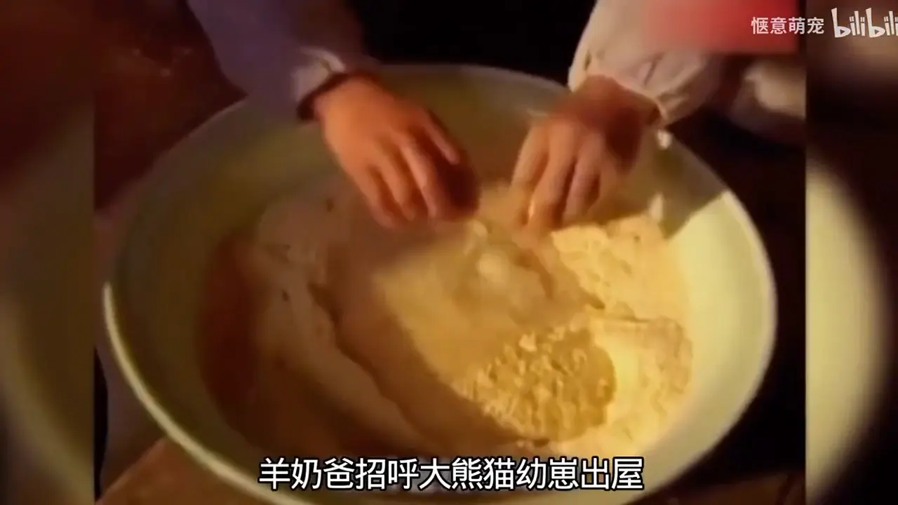 羊奶爸担忧幼崽独处寒冷山间会被冻死或者饿死,于是决定将其带回家再做安排。第二天清晨,天还没亮,羊奶爸便起床开始忙碌。在那个食物匮乏的年代,他为它准备了热腾腾的窝窝头、玉米面、牛奶等美味佳肴。羊奶爸招呼大熊猫幼崽出屋,大熊猫幼崽看到如此丰盛的食物便开始大快朵颐。或许久未品尝如此美味,他顾不得抬头,始终低着头享受美味。