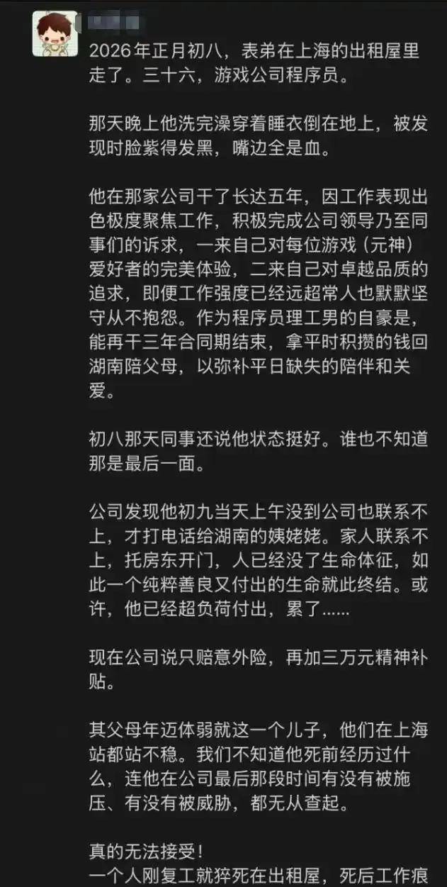 【米哈游内部发文回应员工意外离世:会协助家属妥善处理!健康永远是第一位】近日有媒体消息显示,一名36岁男性程序员在上海出租屋内不幸离世,该员工在米哈游任职已有五年,主要参与《原神》相关开发工作。据了解,当事人于正月初八下班后在住处身故,初九上午被发现。家属方面表示,逝者生前长期处于高强度工作状态,并对公司提出的赔偿方案存在异议。相关情况目前仍在关注中。2月27日下午,米哈游方面表示,经核查,近日确有一名员工在其居住场所不幸去世,公司已成立专项小组,正全力协助家属处理善后事宜,提供一切必要的支持与陪伴。