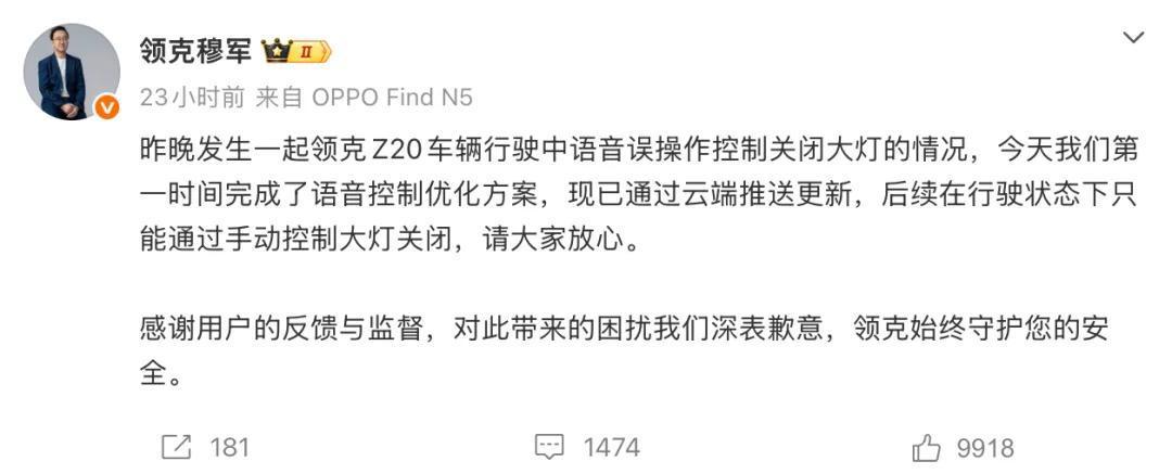【语音控制系统错误关闭大灯导致车祸,领克紧急致歉】据媒体报道,一名男子在驾驶领克Z20行驶时,通过语音助手说“关闭所有阅读灯”,结果却触发语音助手错误操作,导致车辆大灯被熄灭,最终发生车祸。2月26日,针对领克Z20车辆行驶中语音误操作控制关闭大灯的情况,领克汽车销售有限公司副总经理穆军公开回应称:我们第一时间完成了语音控制优化方案,现已通过云端推送更新,后续在行驶状态下只能通过手动控制大灯关闭,请大家放心。感谢用户的反馈与监督,对此带来的困扰深表歉意。(新京报)